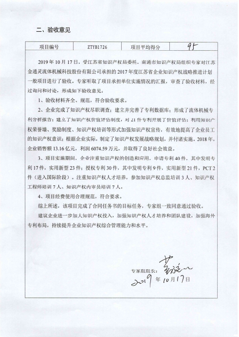 2019年10月17日,根据《省知识产权局关于开展省企业知识产权战略推进计划2017年立项项目验收的通知》和《江苏省知识产...